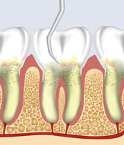 | Scaling: The periodontist first removes the upper level of infected calculus. | Root Planing: Next, he smooths the root to reduce the ability of new bacteria to adhere. |