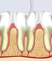 | Scaling: The periodontist first removes the upper level of infected calculus. | Root Planing: Next, he smooths the root to reduce the ability of new bacteria to adhere. |